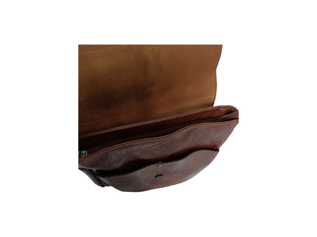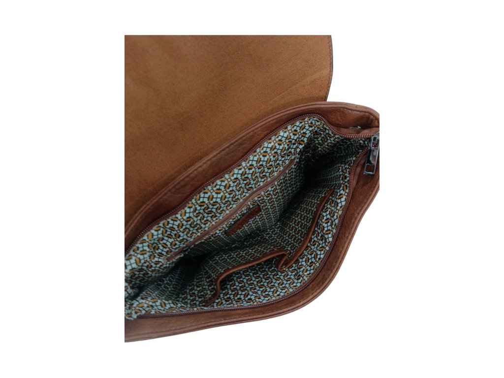 Pod klopou na patent s ozdobnou přezkou se ukrývá přední kapsa na drobnosti a hlavní prostor uzavíratelný zipem.