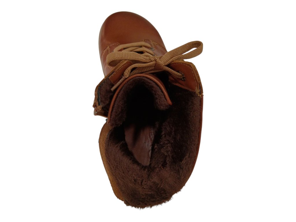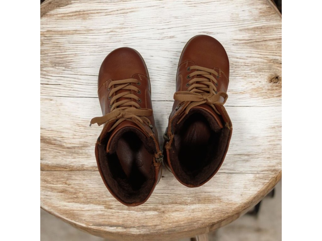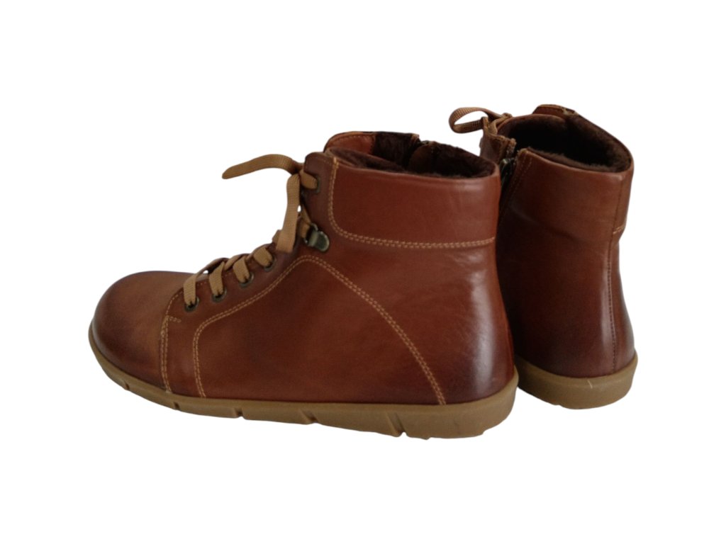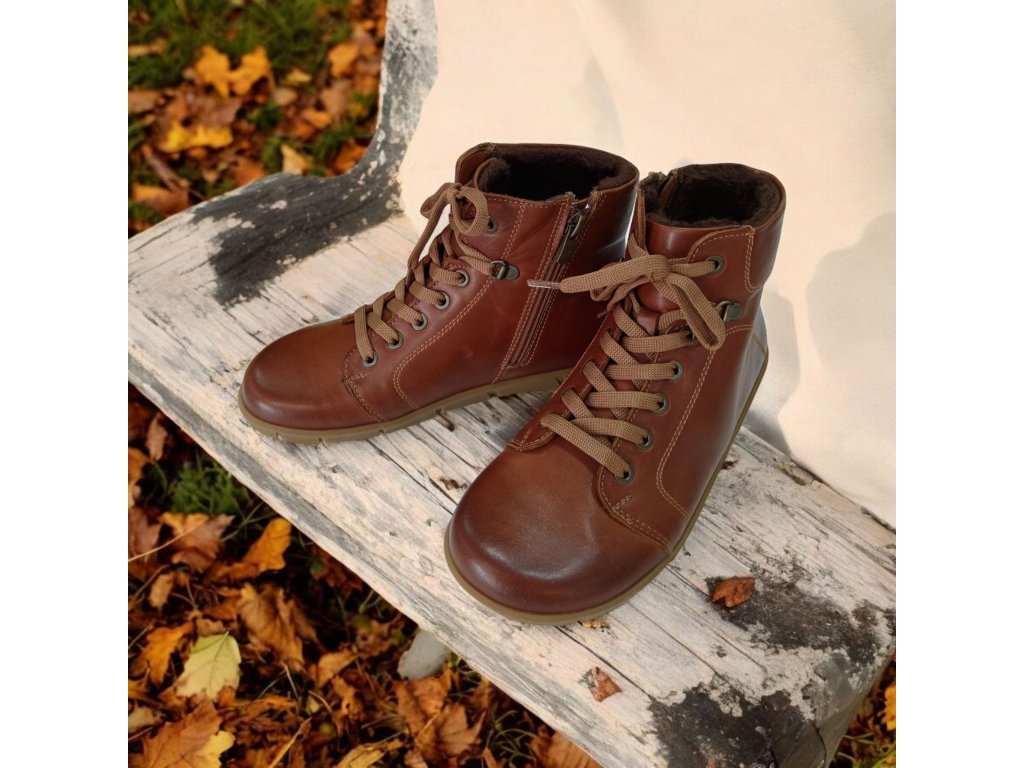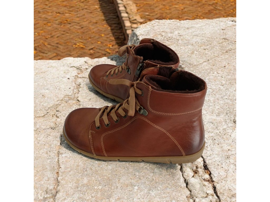 Zateplené kožené barefoot kotníkové boty beBare s anatomickým střihem a flexibilní podrážkou, v teplém hnědém odstínu