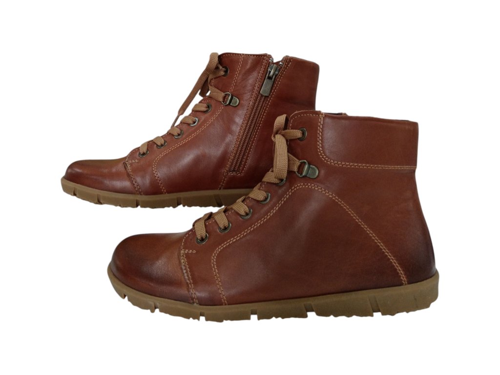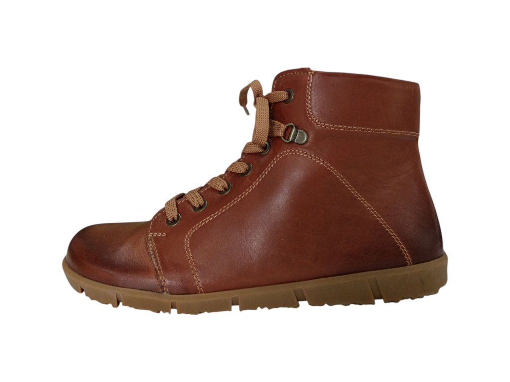 Kožené kotníkové barefoot boty beBare v teplém hnědém odstínu spojují styl, pohodlí a funkčnost. Mají zateplenou podšívku, nevyjímatelnou koženou stélku a celkovou výšku cca 14 cm včetně podešve. Díky anatomickému tvaru, tenké flexibilní podrážce a nulovému dropu respektují přirozený pohyb chodidla, podporují správné držení těla a zdravou chůzi. Zip na boku usnadňuje obouvání.