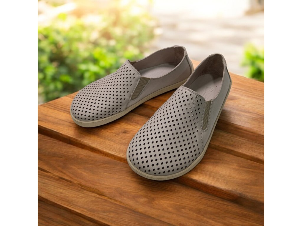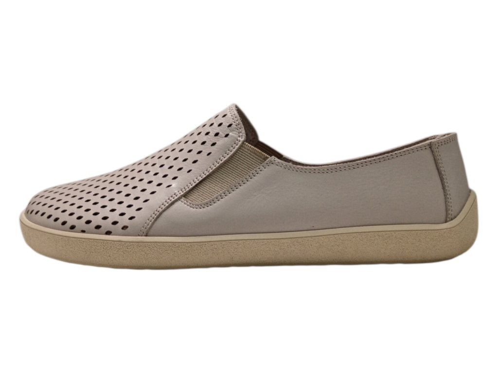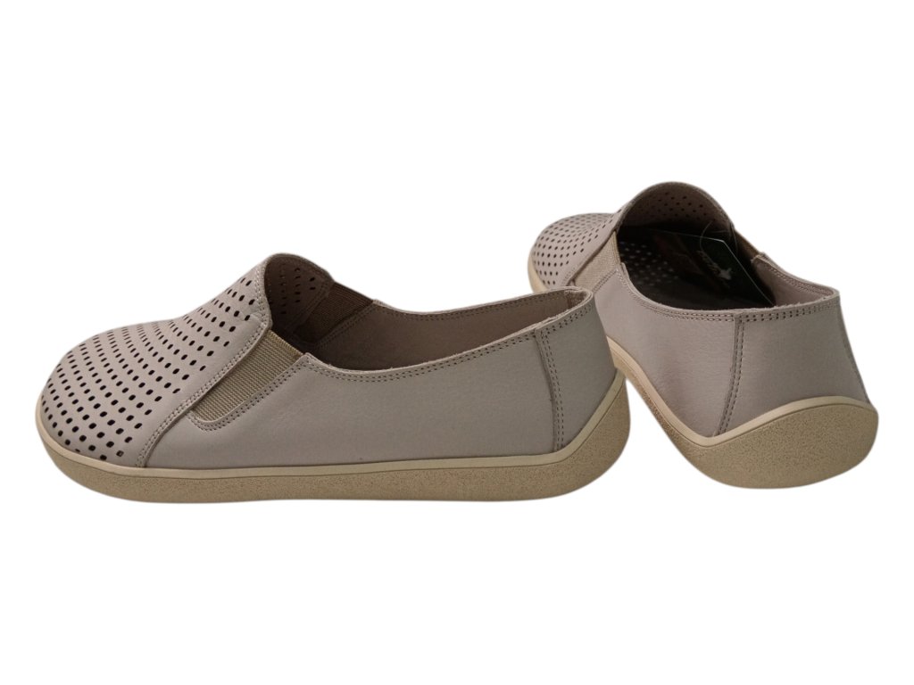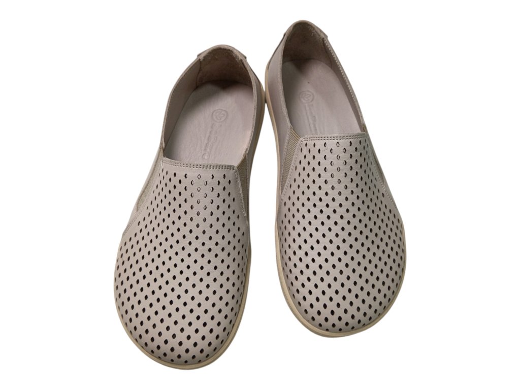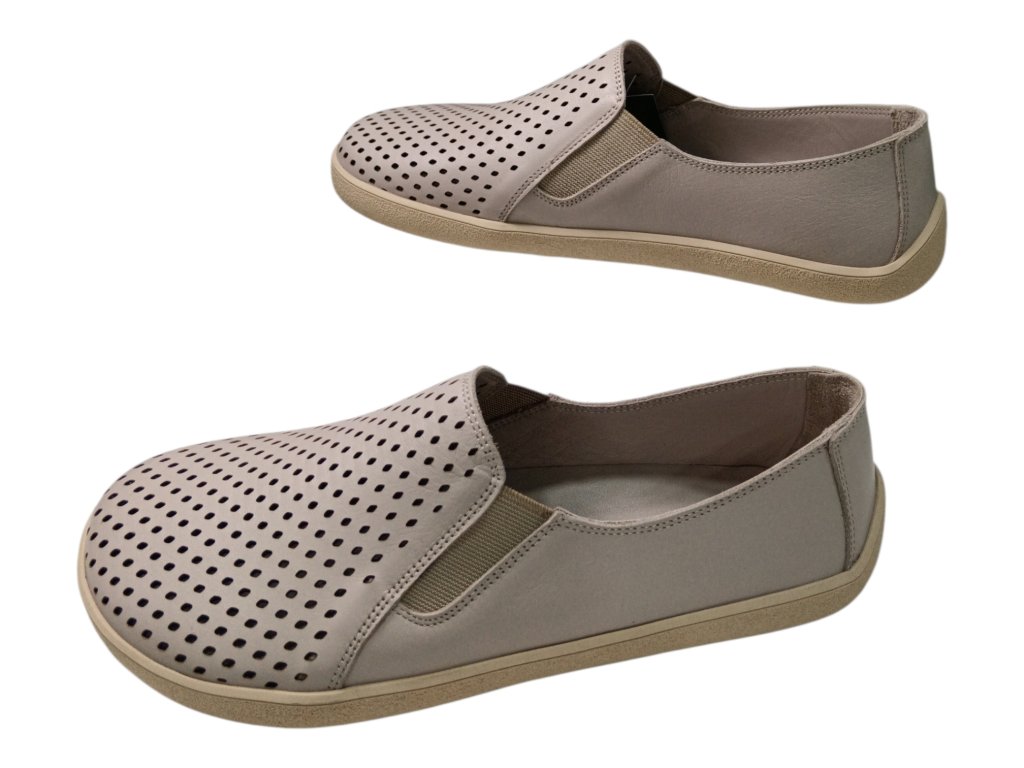 Kožené barefoot boty BEBARE v neutrálním béžovo-šedém odstínu nabízejí přirozený střih, dostatek prostoru pro prsty a maximální pohodlí při každém kroku. Perforovaný kožený vršek a podšívka zajišťují skvělou prodyšnost, zatímco tenká protiskluzová podešev podporuje zdravý a přirozený pohyb chodidla.
