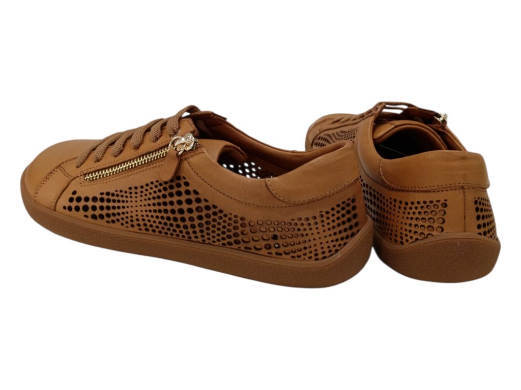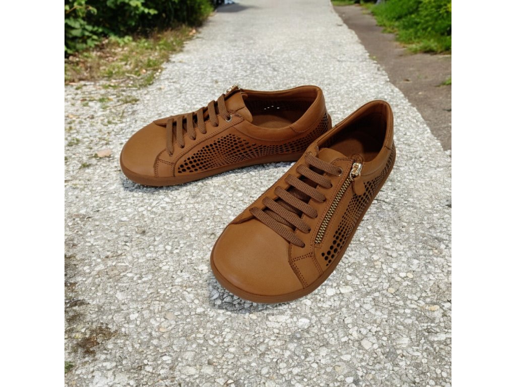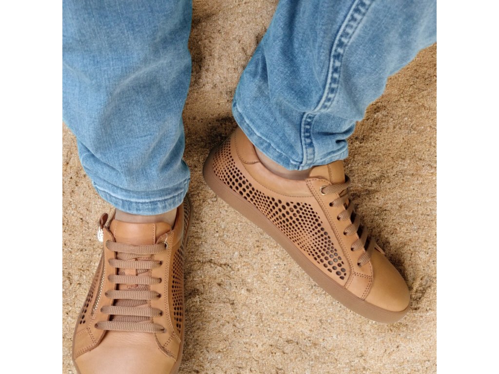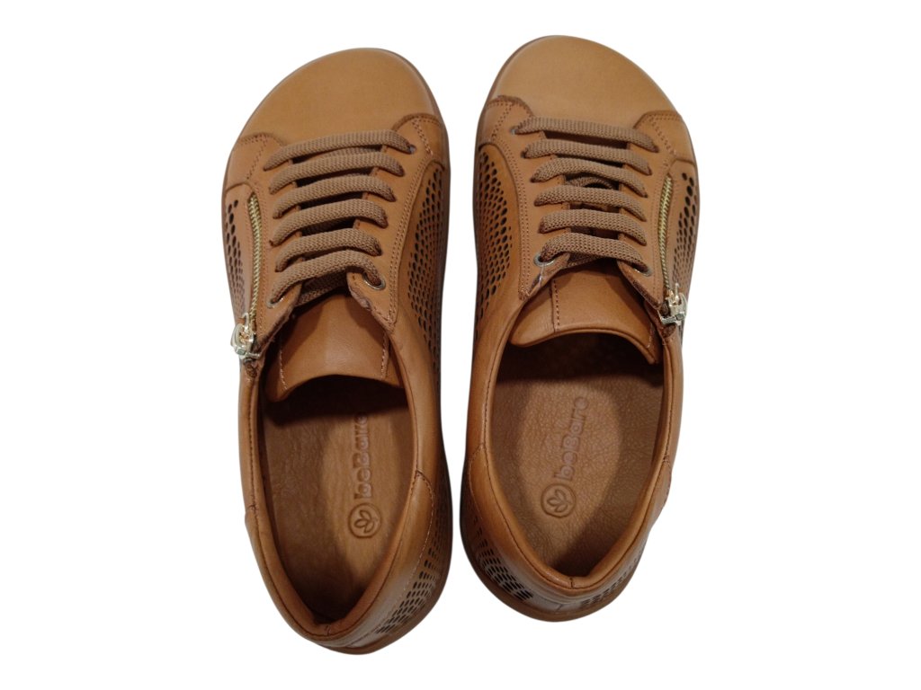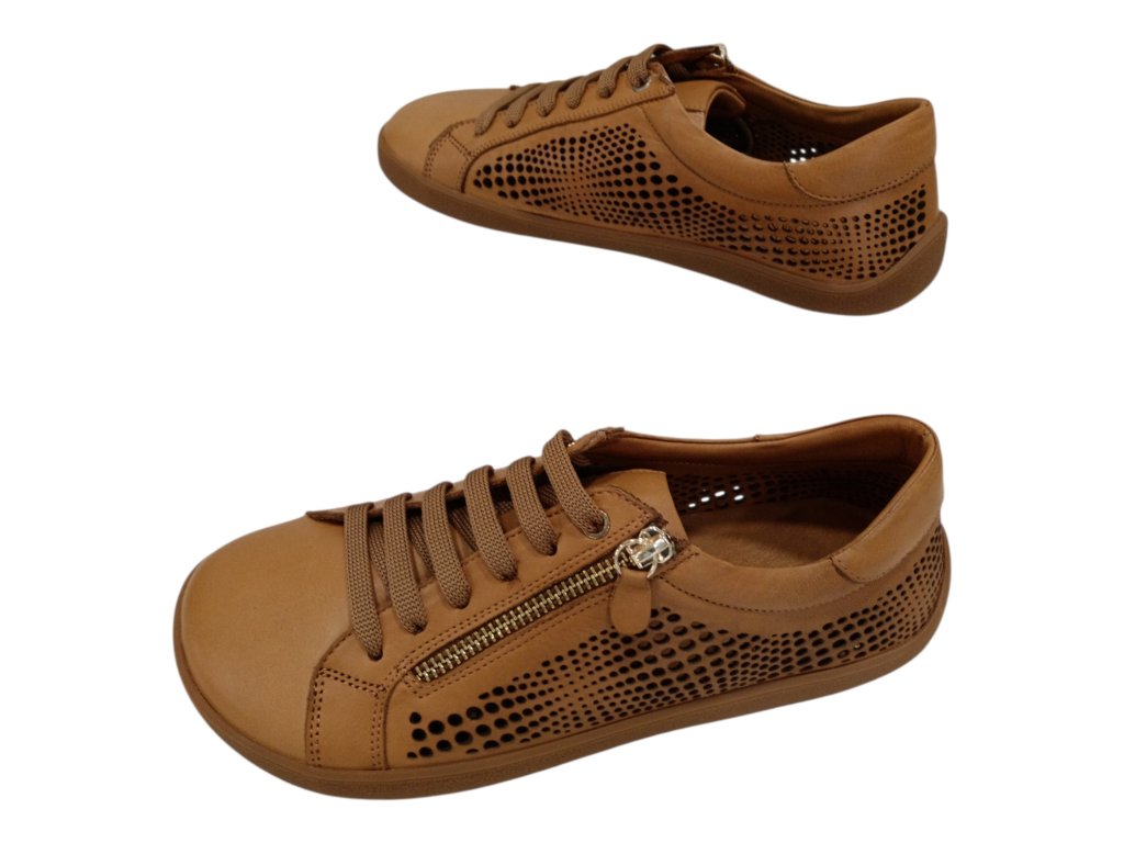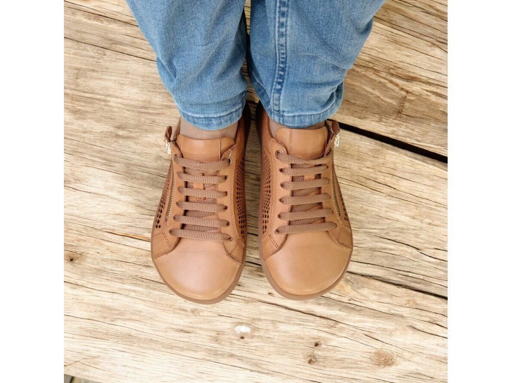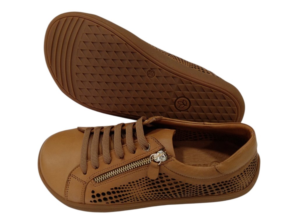 Lehké kožené barefoot boty BEBARE ve světle hnědé barvě s perforací pro maximální prodyšnost. Pohodlný střih, kožená stélka, protiskluzová podešev a praktický boční zip pro snadné obouvání.