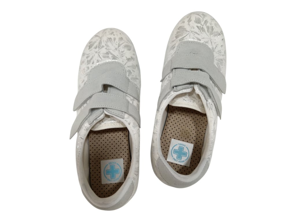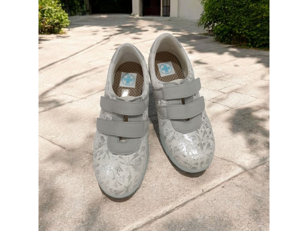 Pohodlné dámské zdravotní boty Medi Line z pružné lycry se snadno přizpůsobí deformitám nohou, jako jsou halluxy nebo kladívkové prsty. Stylový design se stříbrnými květy doplňuje praktické zapínání na suchý zip.