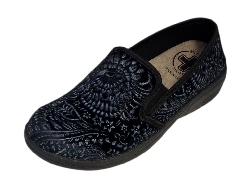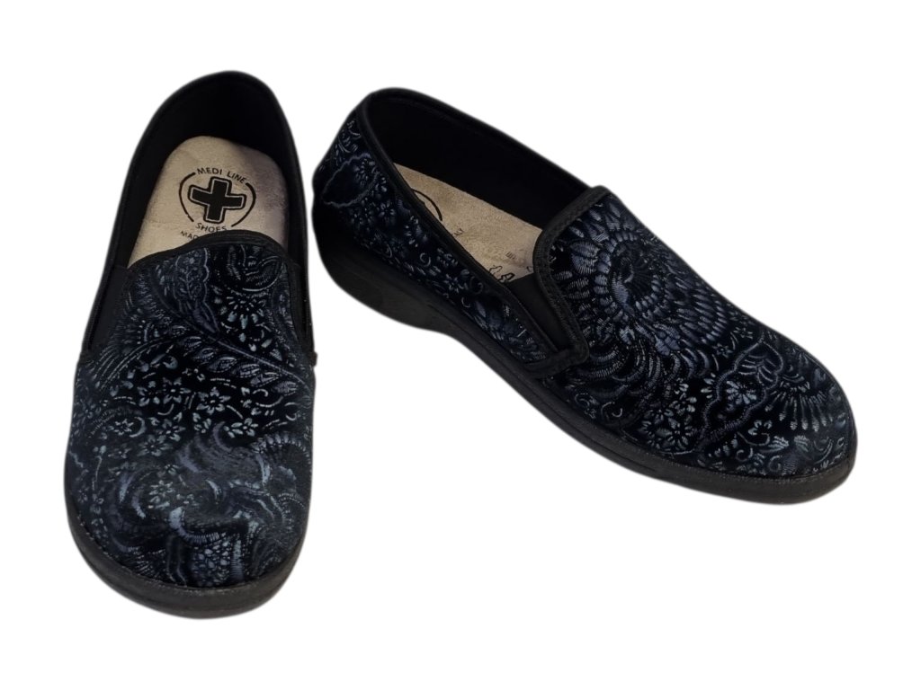 Dámská zdravotní obuv značky Medi Line je vyrobena z pružné stretchové textilie, která se dokonale přizpůsobí tvaru chodidla. Díky tomu je vhodná i pro citlivé nohy, halluxy nebo drobné deformity, aniž by tlačila či způsobovala otlaky. Měkká syntetická stélka zajistí příjemný komfort při každém kroku. Stabilní klínek o výšce 4 cm a zvýšená podešev (2 cm) podporují pohodlnou a bezpečnou chůzi i při celodenním nošení.