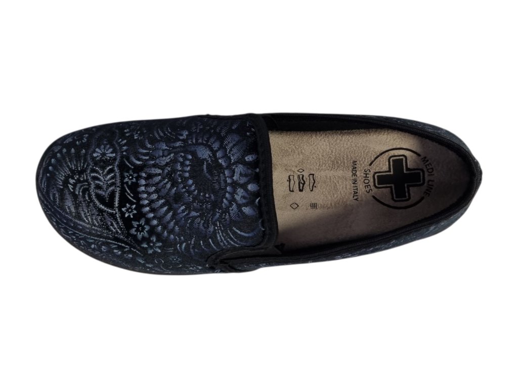 Dámská zdravotní obuv značky Medi Line je vyrobena z pružné stretchové textilie, která se dokonale přizpůsobí tvaru chodidla. Díky tomu je vhodná i pro citlivé nohy, halluxy nebo drobné deformity, aniž by tlačila či způsobovala otlaky. Měkká syntetická stélka zajistí příjemný komfort při každém kroku. Stabilní klínek o výšce 4 cm a zvýšená podešev (2 cm) podporují pohodlnou a bezpečnou chůzi i při celodenním nošení.