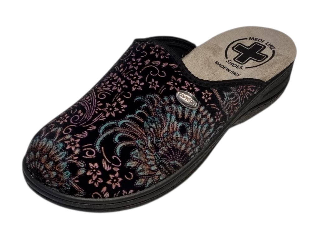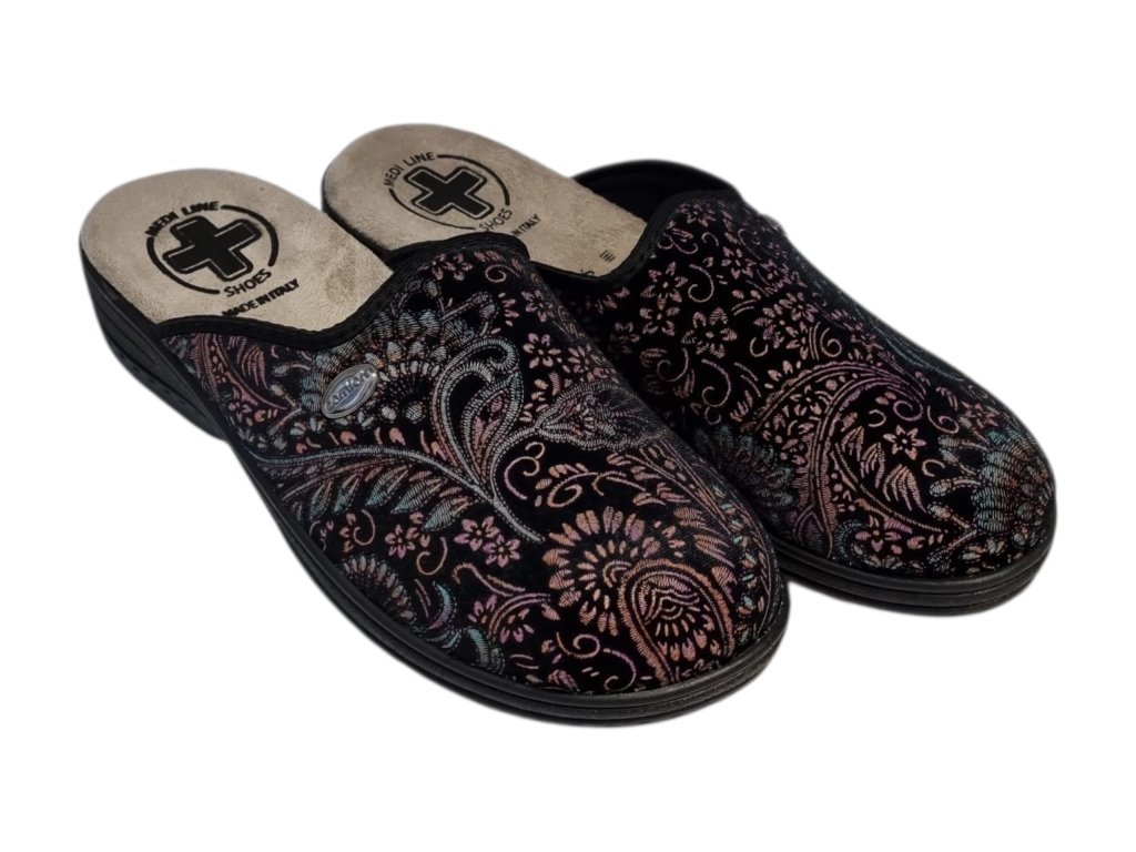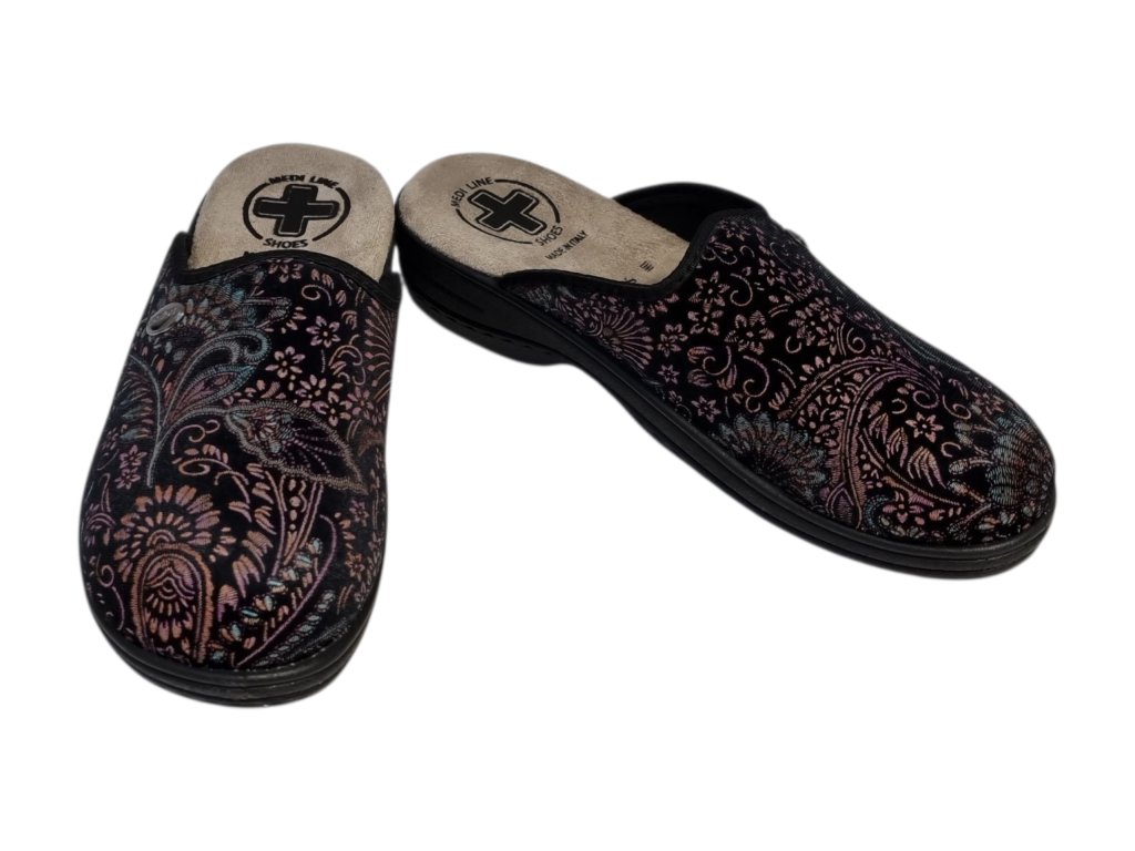 Dámská zdravotní obuv značky Medi Line s plnou špičkou je vyrobena z pružné stretchové textilie, která se dokonale přizpůsobí tvaru chodidla. Díky tomu je vhodná i pro citlivé nohy, halluxy nebo drobné deformity, aniž by tlačila či způsobovala otlaky. Měkká syntetická stélka zajistí příjemný komfort při každém kroku. Stabilní klínek o výšce 4 cm a zvýšená podešev (2 cm) podporují pohodlnou a bezpečnou chůzi i při celodenním nošení.