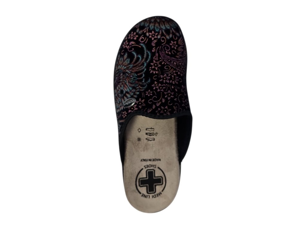 Dámská zdravotní obuv značky Medi Line s plnou špičkou je vyrobena z pružné stretchové textilie, která se dokonale přizpůsobí tvaru chodidla. Díky tomu je vhodná i pro citlivé nohy, halluxy nebo drobné deformity, aniž by tlačila či způsobovala otlaky. Měkká syntetická stélka zajistí příjemný komfort při každém kroku. Stabilní klínek o výšce 4 cm a zvýšená podešev (2 cm) podporují pohodlnou a bezpečnou chůzi i při celodenním nošení.