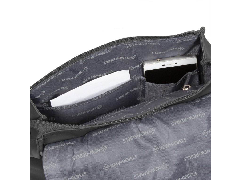 Hlavní část batohu je chráněna klopou a uvnitř najdete dvě kapsy určené na telefon a peněženku, ideální pro snadný přístup k důležitým věcem. Dále je zde přihrádka se zipem do podšívky pro bezpečné uschování dalších předmětů. Na přední a zadní straně jsou umístěny dvě venkovní přihrádky, které poskytují další úložný prostor.