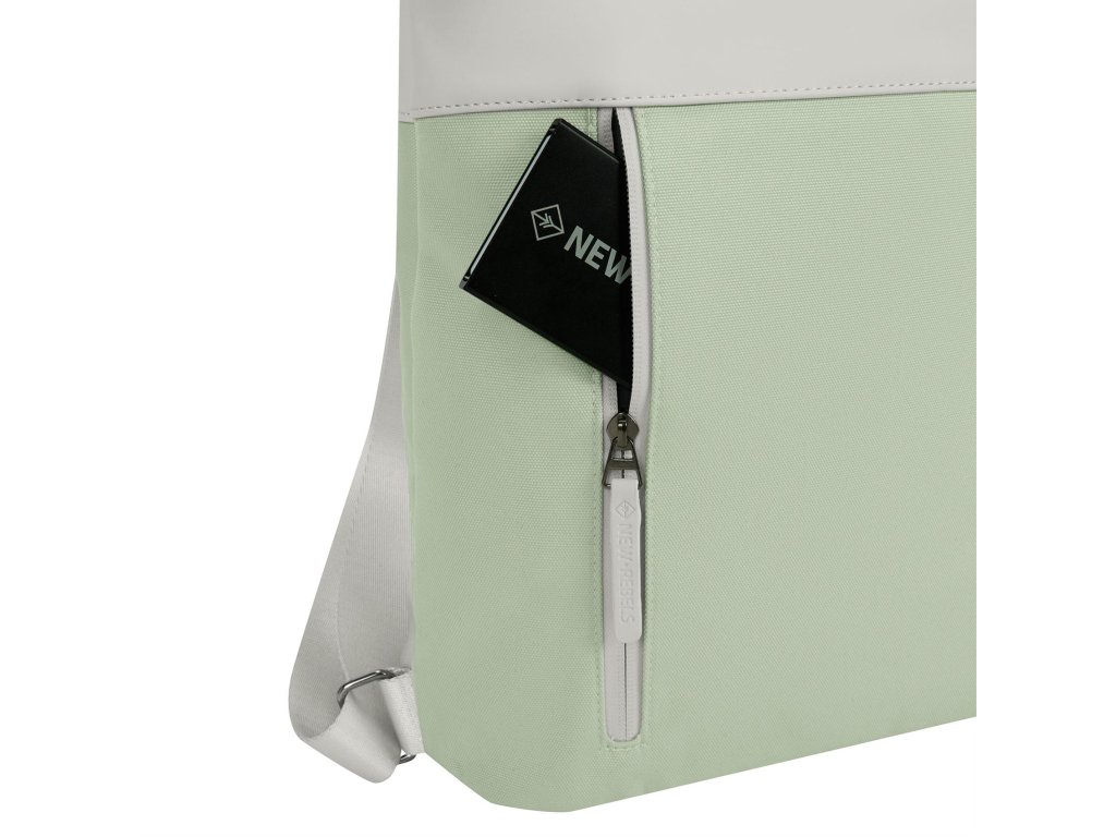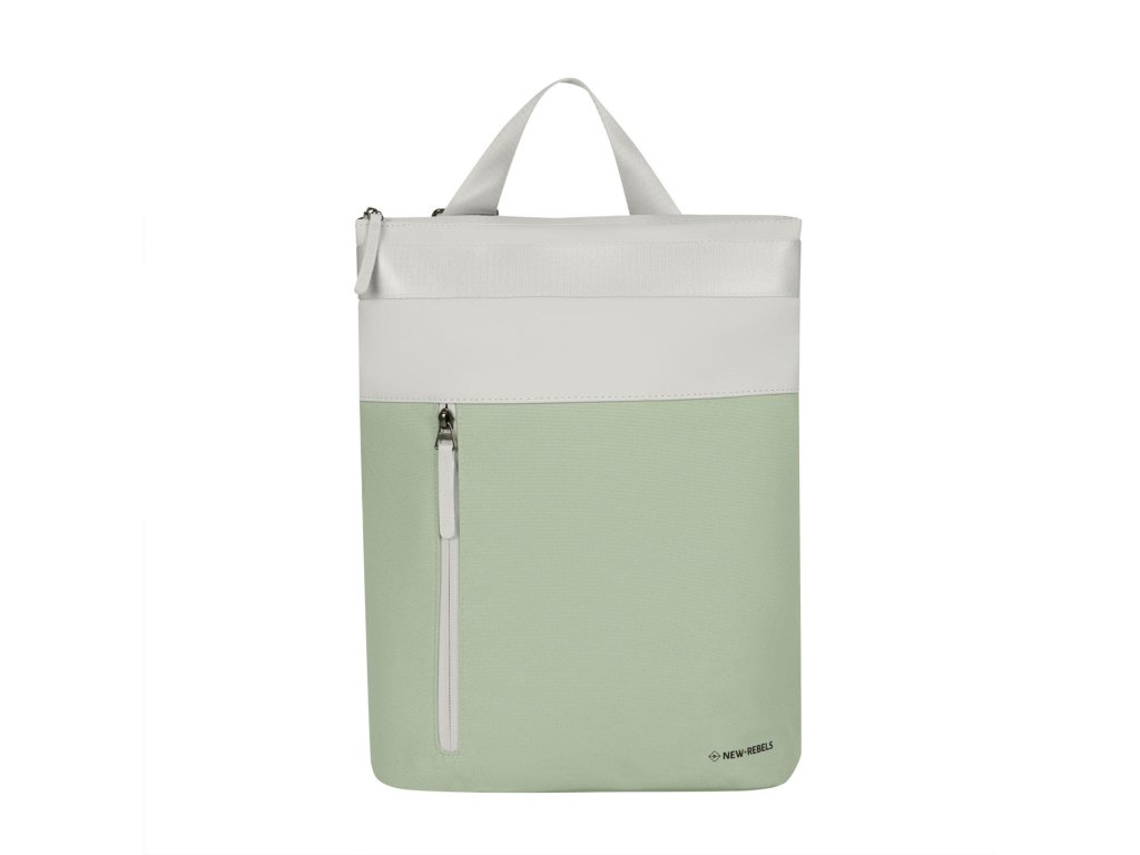 Stylový batoh New Rebels v mátové barvě s prvky světle šedé v oblíbeném messenger stylu, ideální pro každodenní použití díky kombinaci nylonu a tarpaulinu, s praktickými přihrádkami a polstrovanou kapsou na laptop.