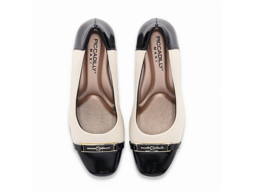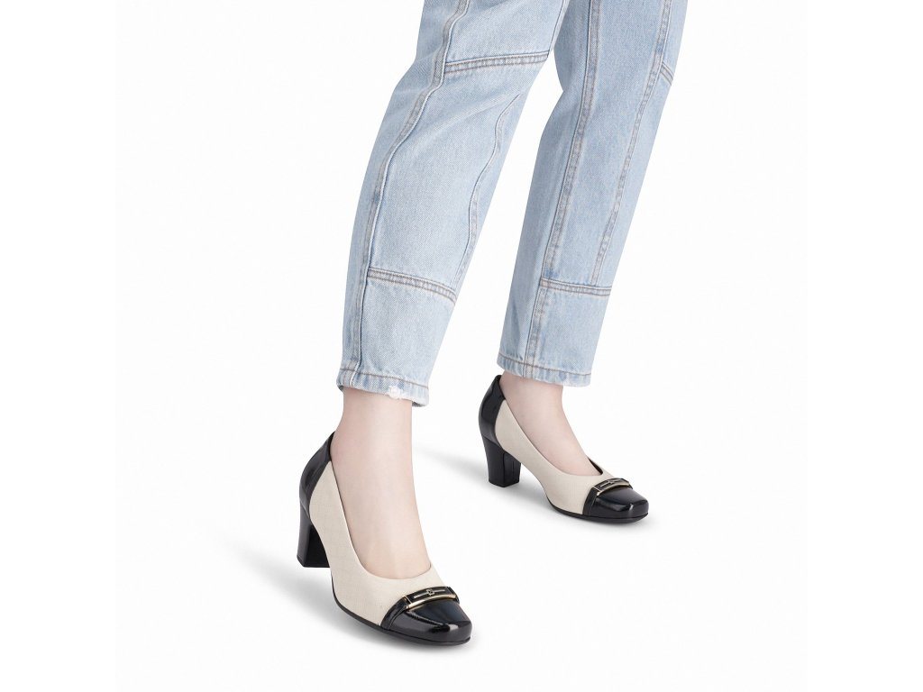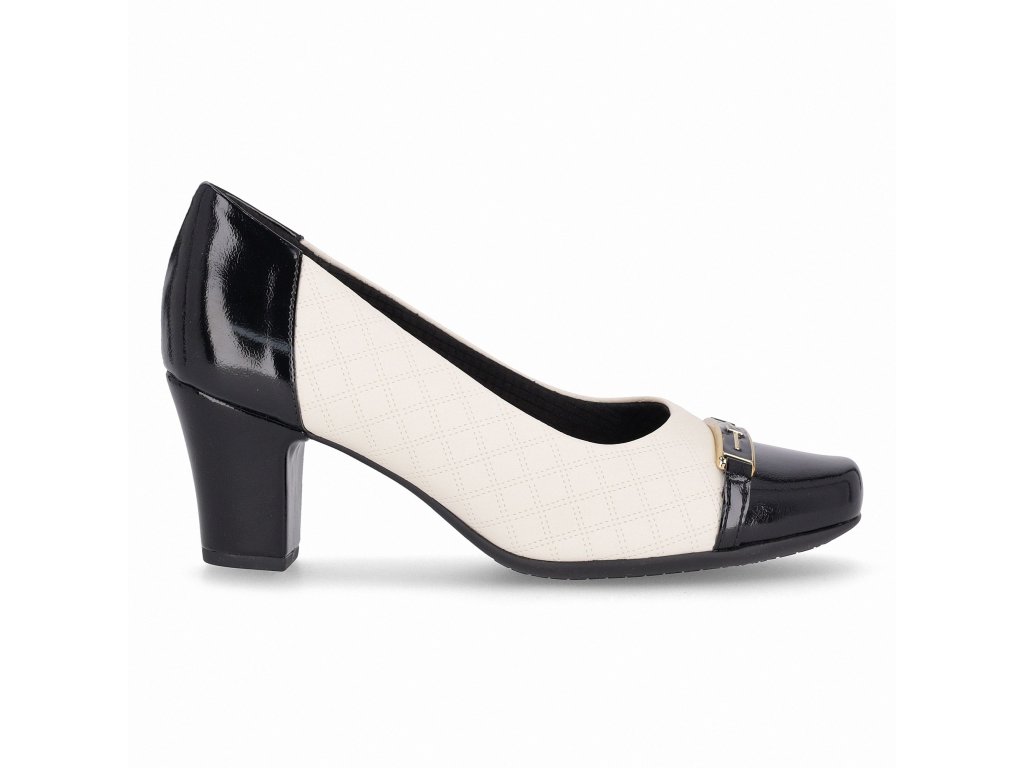 Elegantní kombinace krémové a černé. Krémový svršek doplňuje lesklá černá špička a podpatek s jemnou kovovou ozdobou na nártu.