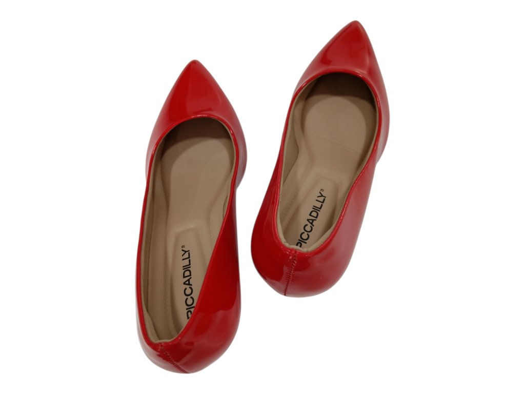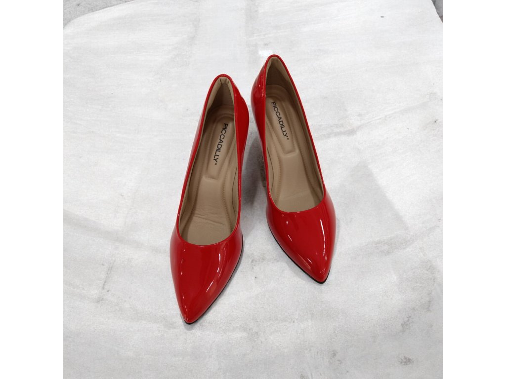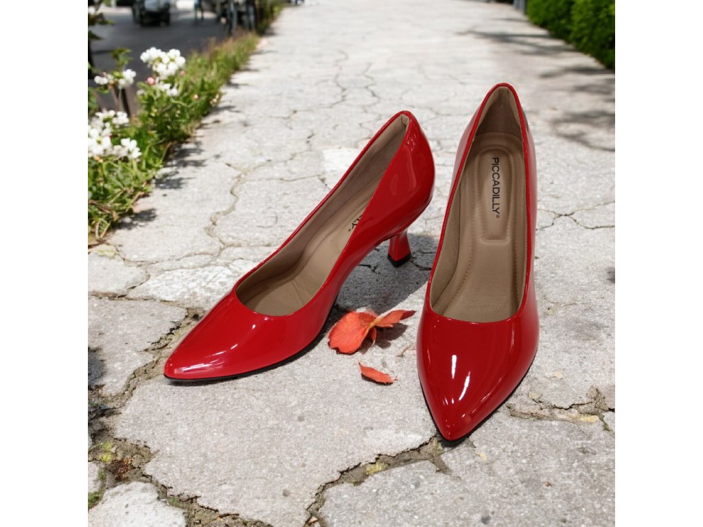 Elegantní dámské lodičky Piccadilly v červené barvě s vysokým leskem. Podpatek vysoký 7 cm, gelové opatky a antibakteriální stélky zajišťují pohodlí i při celodenním nošení.