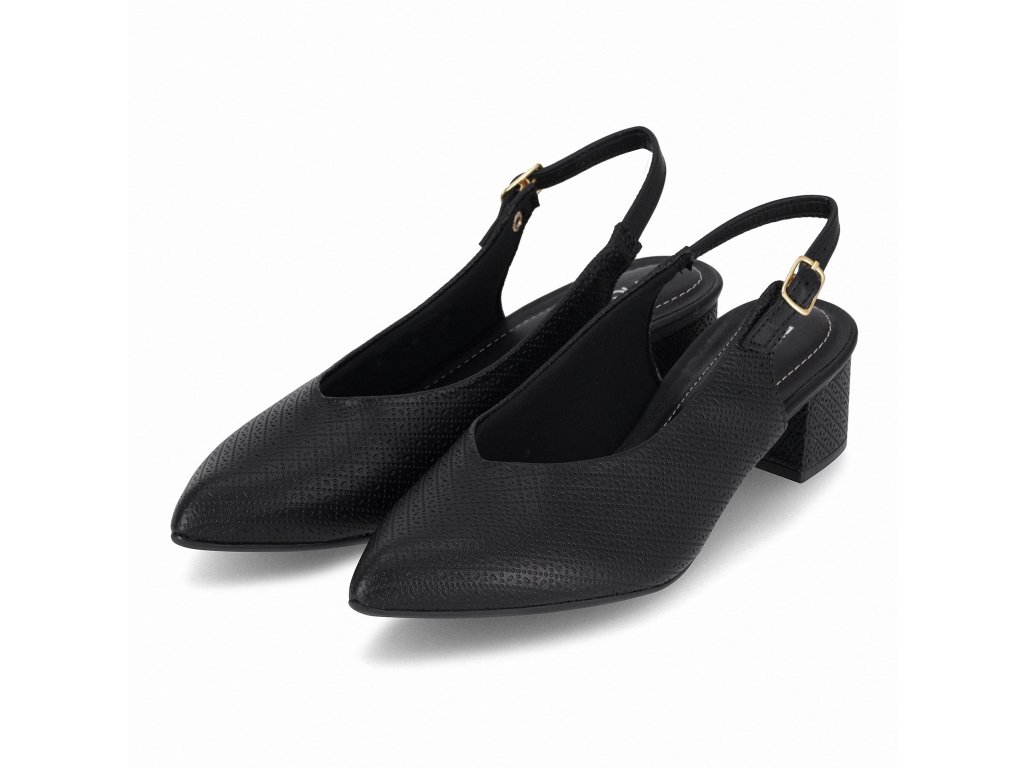 Klasické lodičky s otevřenou patou (slingback). Díky pružnému materiálu se obuv přizpůsobí tvaru chodidla a je vhodná i pro ženy s menším halluxem. Výška podpatku cca 3,5 cm zajišťuje pohodlí při celodenním nošení.