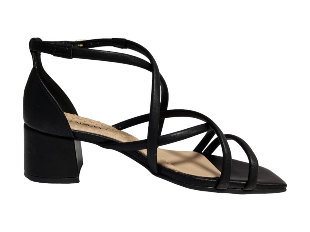 Letní černé sandály na širokém podpatku s nastavitelným páskem kolem kotníku a přes nárt.