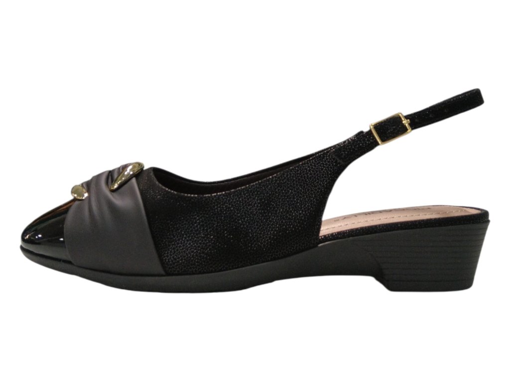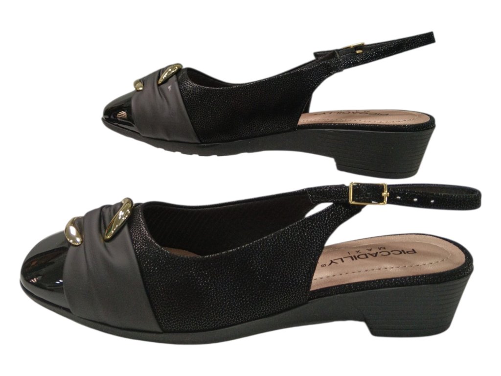 Elegantní černé lodičky s otevřenou patou a jemným páskem přes patu jsou ideální volbou pro pohodlné celodenní nošení. Decentní ozdobný prvek na špičce dodává obuvi ženský a sofistikovaný vzhled.