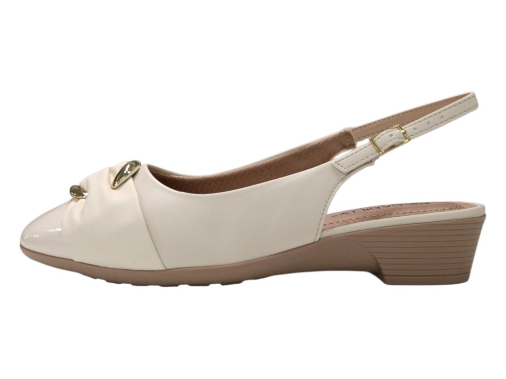 Elegantní krémové lodičky s otevřenou patou a jemným páskem přes patu jsou ideální volbou pro pohodlné celodenní nošení. Decentní ozdobný prvek na špičce dodává obuvi ženský a sofistikovaný vzhled.