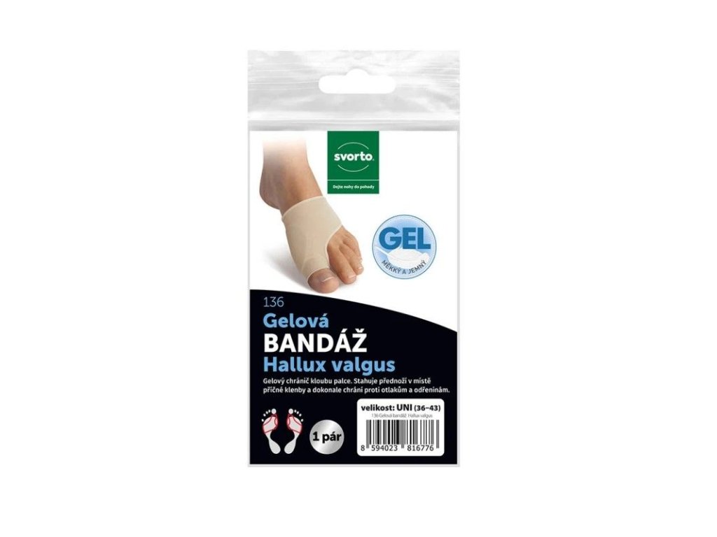 Jemná a elastická gelová bandáž, která účinně podporuje přednoží a chrání kloub vbočeného palce během každodenního nošení.